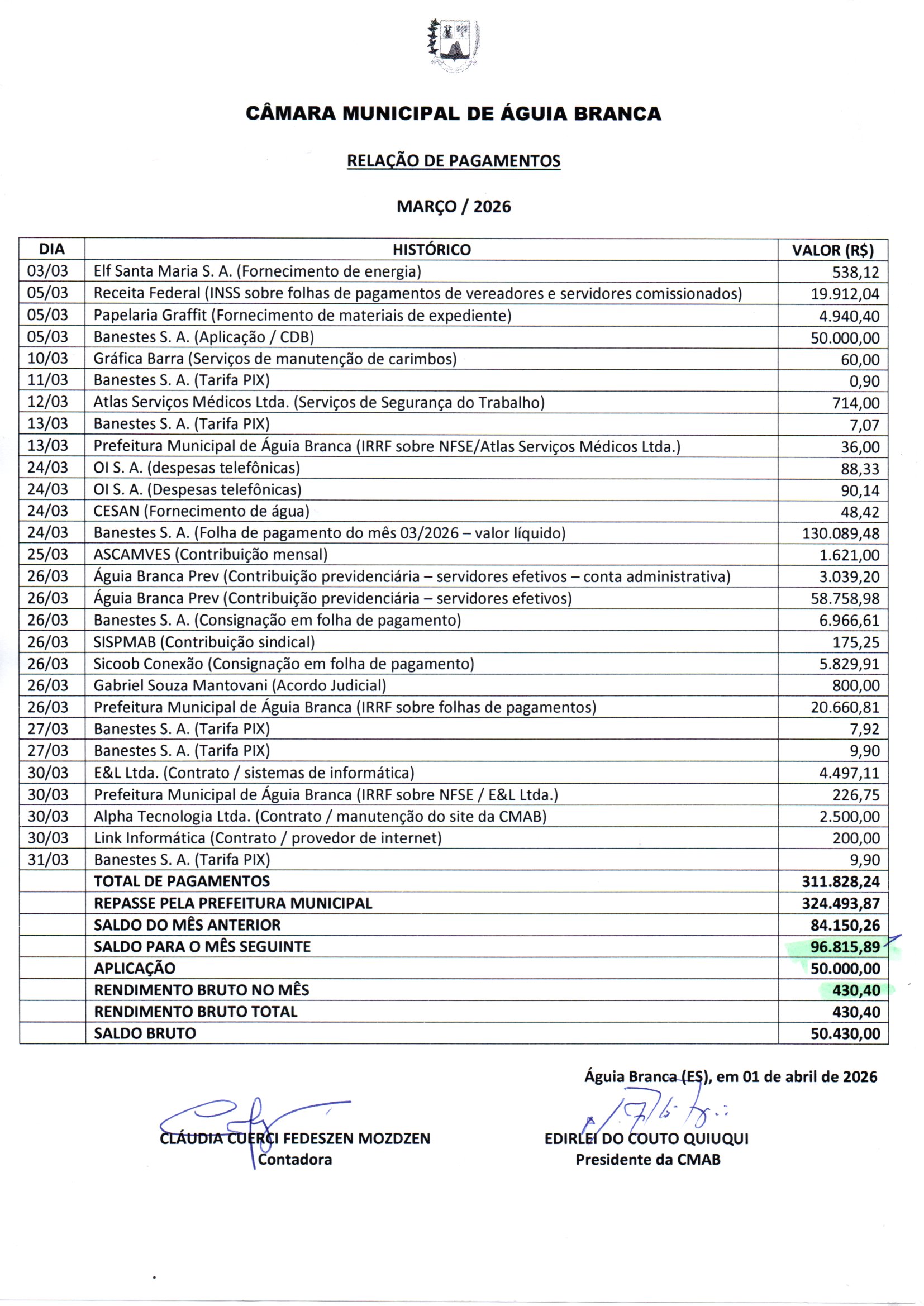 RELAÇÃO DE PAGAMENTOS DA CÂMARA MUNICIPAL DE ÁGUIA BRANCA/ES REFERENTE AO MÊS DE MARÇO DE 2026